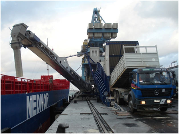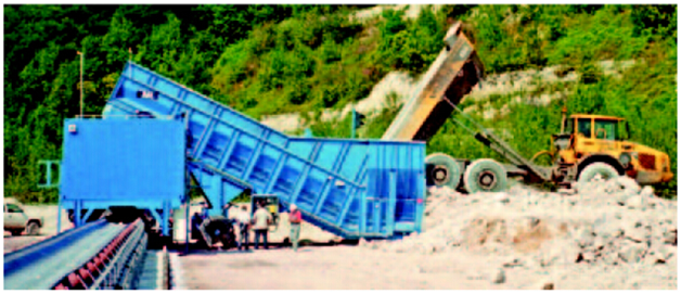 裝船機(jī)進(jìn)料口一般在輸送帶上方,位置很高,自卸卡車卸貨時(shí)車廂后部位置很底;采用裝載機(jī)雖然能將物料送到一定高度,但效率很差;裝船機(jī)能力一般很大,要確保裝船機(jī)的運(yùn)行效率,須有多輛運(yùn)輸車為其供料,最大限度地提高系統(tǒng)的處理速度和使車輛定位延遲效應(yīng)最小化,且具備穩(wěn)流功能,保證連續(xù)、均勻、平穩(wěn)地供料;自卸卡車每車二三十噸,要讓車子迅速卸貨,須提供緩沖儲(chǔ)存裝置;輸送帶水平段要有很大的強(qiáng)度,承受物料對(duì)進(jìn)料裝置的強(qiáng)烈沖擊;進(jìn)料裝置與裝船機(jī)要能有分有合,移動(dòng)時(shí)要同步,具有移動(dòng)的靈活性;該裝置可以輕松遷移到其它港口處,從而提升設(shè)備的利用率;當(dāng)輸送有塵物料時(shí),可配套高效的除塵設(shè)施。